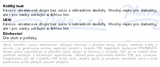 Kávovo -smetanové drops bez cukru s náhradními sladidly. Vhodný nejen pro diabetiky, ale i pro osoby udržující si štíhlou linii.