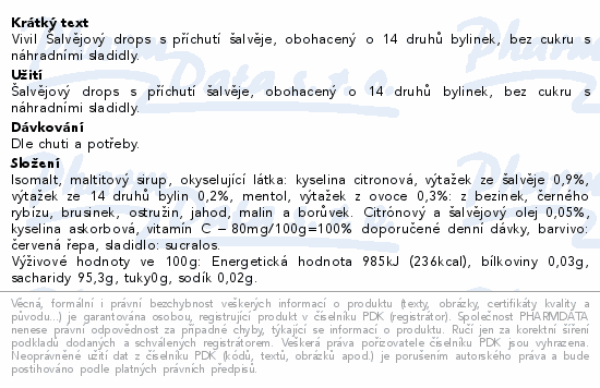 Vivil Šalvějový drops s příchutí šalvěje, obohacený o 14 druhů bylinek, bez cukru s náhradními sladidly.