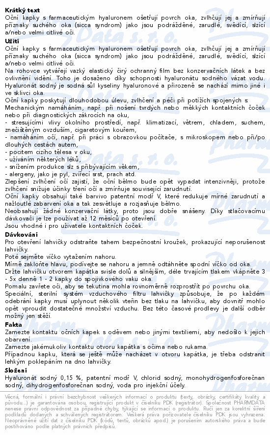 Oční kapky s farmaceutickým hyaluronem ošetřují povrch oka, zvlhčují jej a zmírňují příznaky suchého oka (sicca syndrom) jako jsou podrážděné, zarudlé, svědící, slzící a/nebo velmi citlivé oči.