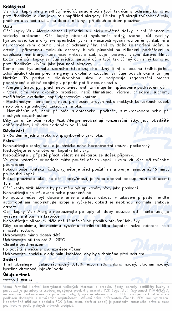 Vizik oční kapky alergie zvlhčují svědící, zarudlé oči a tvoří tak účinný ochranný komplex proti škodlivým vlivům jako jsou například alergeny. Účinkují při alergii způsobené pyly, prachem a zvířecí srstí. Jsou dobře snášeny i při dlouhodobém používání.