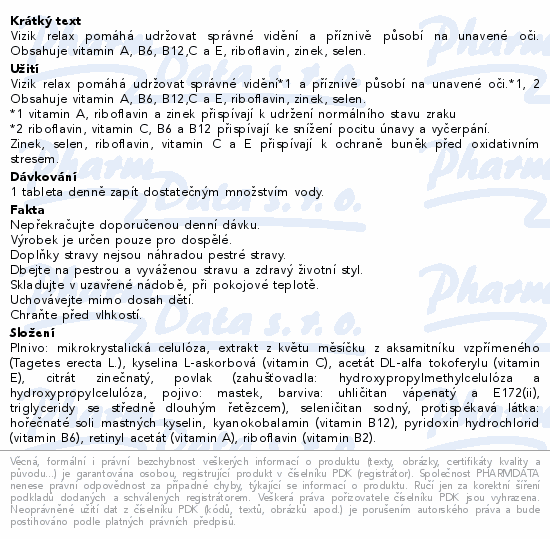 Vizik relax pomáhá udržovat správné vidění a příznivě působí na unavené oči. Obsahuje vitamin A, B6, B12,C a E, riboflavin, zinek, selen.
