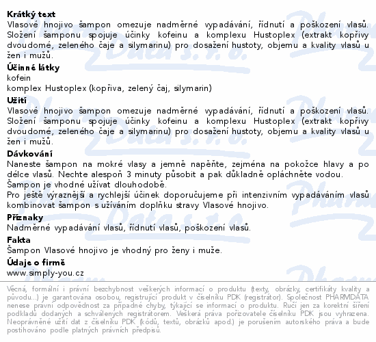 Vlasové hnojivo šampon omezuje nadměrné vypadávání, řídnutí a poškození vlasů. Složení šamponu spojuje účinky kofeinu a komplexu Hustoplex (extrakt kopřivy dvoudomé, zeleného čaje a silymarinu) pro dosažení hustoty, objemu a kvality vlasů u žen i mužů.