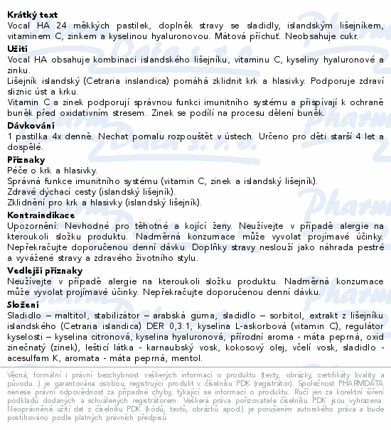 Vocal HA 24 měkkých pastilek, doplněk stravy se sladidly, islandským lišejníkem, vitaminem C, zinkem a kyselinou hyaluronovou. Mátová příchuť. Neobsahuje cukr.