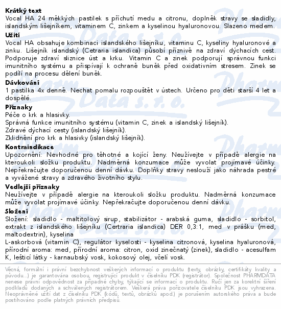 Vocal HA 24 měkkých pastilek s příchutí medu a citronu, doplněk stravy se sladidly, islandským lišejníkem, vitaminem C, zinkem a kyselinou hyaluronovou. Slazeno medem.
