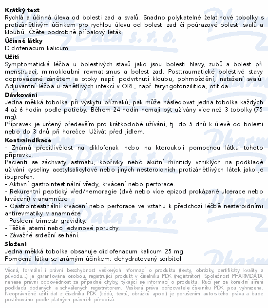 Léčivou látkou je diclofenacum kalicum. Jedna měkká tobolka obsahuje 25 mg diclofenacum kalicum.