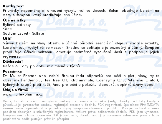 Přípravky napomáhající omezení výskytu vší ve vlasech. Balení obsahuje balzám na vlasy a šampon, který prodlužuje jeho účinek.