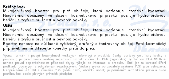 Mikrojehličkový booster pro pleť obličeje, která potřebuje intenzivní hydrataci. Niacinamid obsažený ve složení kosmetického přípravku posiluje hydrolipidovou bariéru a zvyšuje pružnost a pevnost pokožky.