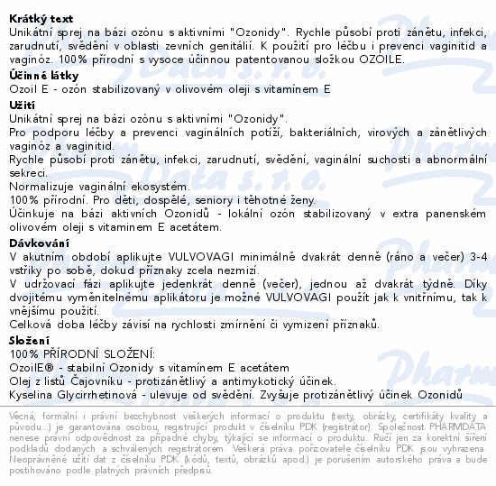 Unikátní sprej na bázi ozónu s aktivními "Ozonidy". Rychle působí proti zánětu, infekci, zarudnutí, svědění v oblasti zevních genitálií. K použití pro léčbu i prevenci vaginitid a vaginóz. 100% přírodní s vysoce účinnou patentovanou složkou OZOILE.