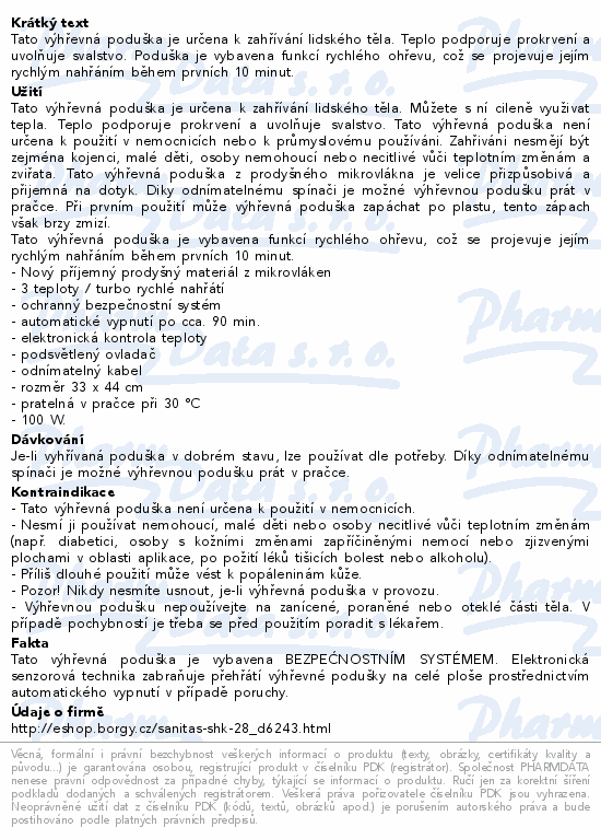 Tato výhřevná poduška je určena k zahřívání lidského těla. Teplo podporuje prokrvení a uvolňuje svalstvo. Poduška je vybavena funkcí rychlého ohřevu, což se projevuje jejím rychlým nahřáním během prvních 10 minut.