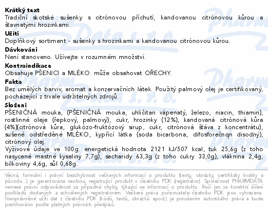 Tradiční skotské sušenky s citrónovou příchutí, kandovanou citrónovou kůrou a šťavnatými hrozinkami.