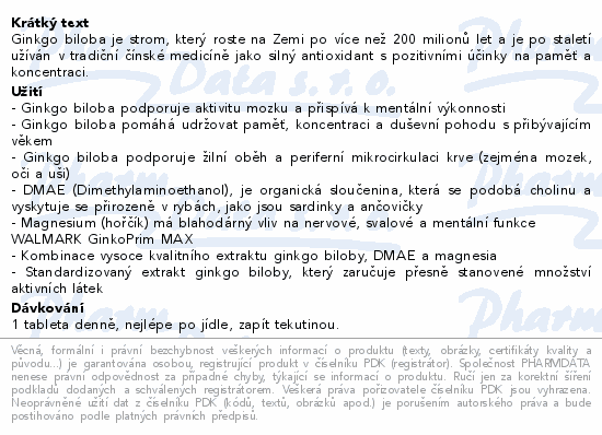 Kvalitní extrakt ginkgo biloby pro podporu paměti, koncentrace a mozkové činnosti obohacený o DMAE a magnesium. Podporuje také žilní oběh a periferní mikrocirkulaci krve. (zejména například mozek, oči a uši) Magnesium má blahodárný vliv na nervový a svalový systém, podporuje mentální výkonnost.