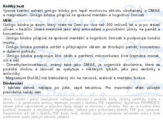 Vysoce kvalitní extrakt ginkgo biloby pro lepší mozkovou aktivitu obohacený o DMAE a magnesium. Ginkgo biloba přispívá ke správné mentální a kognitivní činnosti.