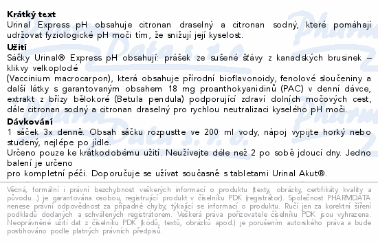 Urinal Express pH obsahuje citronan draselný a citronan sodný, které pomáhají udržovat fyziologické pH moči tím, že snižují její kyselost.