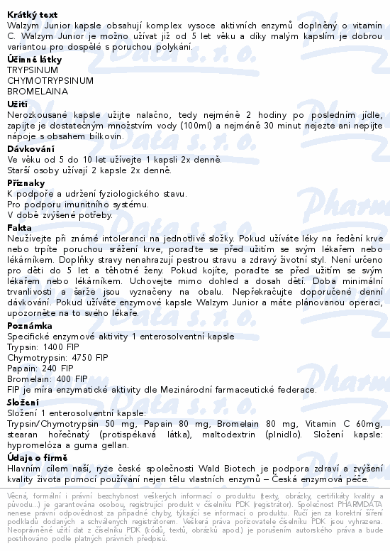 Walzym Junior kapsle obsahují komplex vysoce aktivních enzymů doplněný o vitamín C. Walzym Junior je možno užívat již od 5 let věku a díky malým kapslím je dobrou variantou pro dospělé s poruchou polykání.