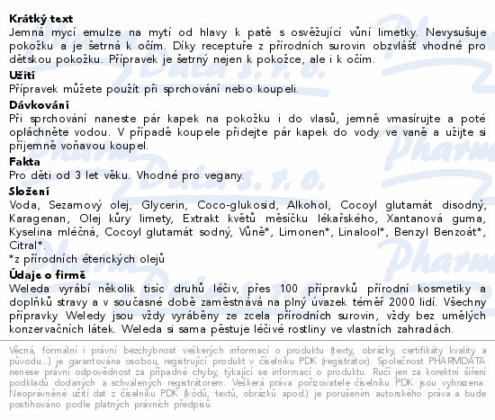 Jemná mycí emulze na mytí od hlavy k patě s osvěžující vůní limetky. Nevysušuje pokožku a je šetrná k očím. Díky receptuře z přírodních surovin obzvlášť vhodné pro dětskou pokožku. Přípravek je šetrný nejen k pokožce, ale i k očím.