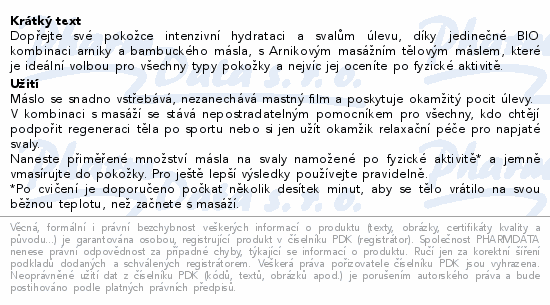 Dopřejte své pokožce intenzivní hydrataci a svalům úlevu, díky jedinečné BIO kombinaci arniky a bambuckého másla, s Arnikovým masážním tělovým máslem, které je ideální volbou pro všechny typy pokožky a nejvíc jej oceníte po fyzické aktivitě.