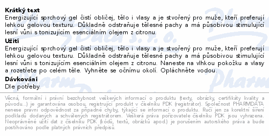Energizující sprchový gel čistí obličej, tělo i vlasy a je stvořený pro muže, kteří preferují lehkou gelovou texturu. Důkladně odstraňuje tělesné pachy a má působivou stimulující lesní vůni s tonizujícím esenciálním olejem z citronu.