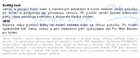 Jemný a pečující holicí krém s mandlovým extraktem a kozím mlékem chrání pokožku při holení a podporuje její přirozenou obnovu. Při použití vytváří luxusní krémovou pěnu, která umožňuje komfortní a dokonale hladké oholení.