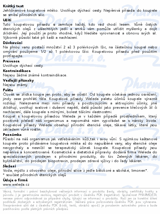 Jehličnanové koupelové mléko. Uvolňuje dýchací cesty. Nepěnivá přísada do koupele se směsí přírodních silic.