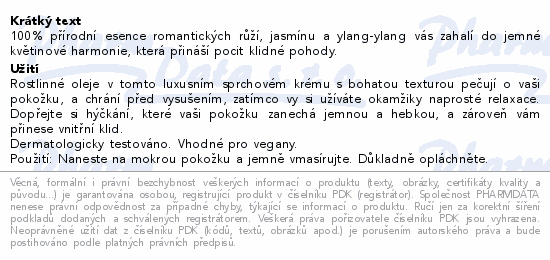 100% přírodní esence romantických růží, jasmínu a ylang-ylang vás zahalí do jemné květinové harmonie, která přináší pocit klidné pohody.