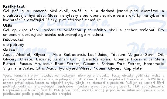 Gel pečuje o unavené oční okolí, osvěžuje jej a dodává jemné pleti okamžitou a dlouhotrvající hydrataci. Složení s výtažky z bio opuncie, aloe vera a okurky má výborné hydratační a osvěžující účinky, pleť efektivně zjemňuje.