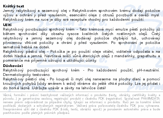 Jemný rakytníkový a sezamový olej v Rakytníkovém sprchovém krému dodají pokožce výživu a ochrání ji před vysušením, esenciální oleje z citrusů povzbudí a osvěží mysl. Rakytníkový krém na ruce je díky své receptuře vhodný pro každodenní použití.