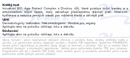 Inovativní BIO Age Protect Complex s Divokou růží, která posiluje kožní bariéru a s antioxidačním bílým čajem, který zabraňuje předčasnému stárnutí pleti. Intenzivní hydratace a redukce jemných vrásek pro viditelně hladší a zářivější pleť.