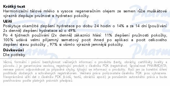 Harmonizační tělové mléko s vysoce regeneračním olejem ze semen růže muškátové výrazně zlepšuje pružnost a hydrataci pokožky.