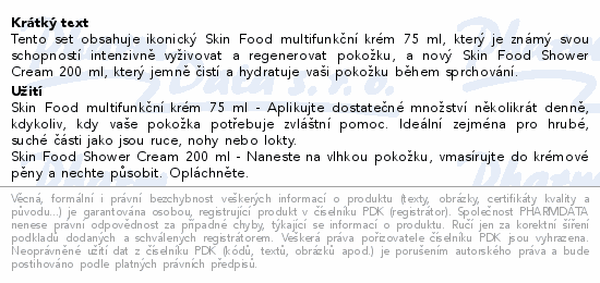 Tento set obsahuje ikonický Skin Food multifunkční krém 75 ml, který je známý svou schopností intenzivně vyživovat a regenerovat pokožku, a nový Skin Food Shower Cream 200 ml, který jemně čistí a hydratuje vaši pokožku během sprchování.