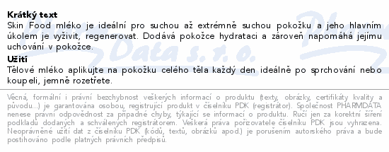 Skin Food mléko je ideální pro suchou až extrémně suchou pokožku a jeho hlavním úkolem je vyživit, regenerovat. Dodává pokožce hydrataci a zároveň napomáhá jejímu uchování v pokožce.