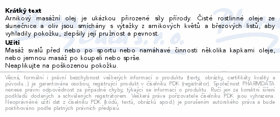 Arnikový masážní olej je ukázkou přirozené síly přírody. Čisté rostlinné oleje ze slunečnice a oliv jsou smíchány s výtažky z arnikových květů a březových listů, aby vyhladily pokožku, zlepšily její pružnost a pevnost.
