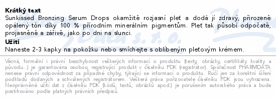 Sunkissed Bronzing Serum Drops okamžitě rozjasní pleť a dodá jí zdravý, přirozeně opálený tón díky 100 % přírodním minerálním pigmentům. Pleť tak působí odpočatě, projasněně a zářivě, jako po dni na slunci.