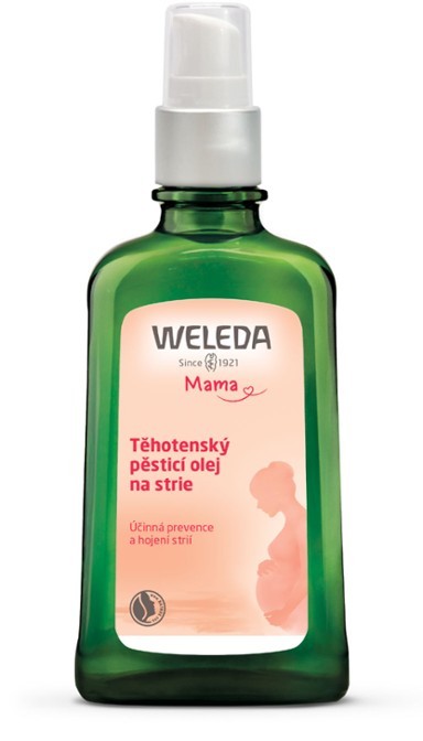 Těhotenský pěstící olej. Při pravidelných masážích předchází vzniku pajizévek (strií) na břiše, stehnech, hýždích a prsou.