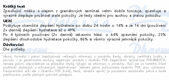 Zpevňující mléko s olejem z granátových semínek velmi dobře tonizuje, zpevňuje a výrazně zlepšuje pružnost zralé pokožky. Je tedy ideální pro suchou a zralou pokožku.