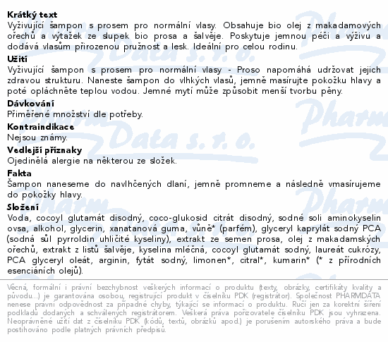 Vyživující šampon s prosem pro normální vlasy. Obsahuje bio olej z makadamových ořechů a výtažek ze slupek bio prosa a šalvěje. Poskytuje jemnou péči a výživu a dodává vlasům přirozenou pružnost a lesk. Ideální pro celou rodinu.