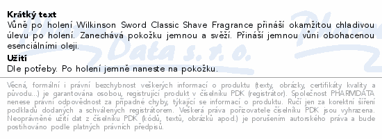 Vůně po holení Wilkinson Sword Classic Shave Fragrance přináší okamžitou chladivou úlevu po holení. Zanechává pokožku jemnou a svěží. Přináší jemnou vůni obohacenou esenciálními oleji.