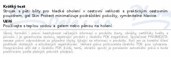 Strojek s pěti břity pro hladké oholení v cestovní velikosti s praktickým cestovním pouzdrem, gel Skin Protect minimalizuje podráždění pokožky, vyměnitelné hlavice.
