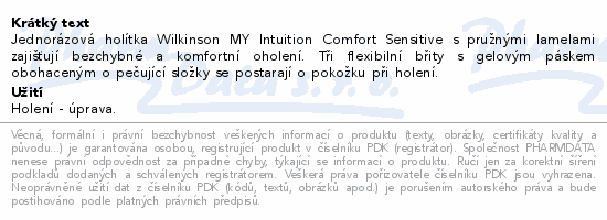 Jednorázová holítka Wilkinson MY Intuition Comfort Sensitive s pružnými lamelami zajišťují bezchybné a komfortní oholení. Tři flexibilní břity s gelovým páskem obohaceným o pečující složky se postarají o pokožku při holení.