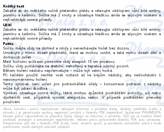 Zabalte se do měkkého ručně pleteného plédu a relaxujte obklopeni vůní bílé ambry, jasmínu a kašmíru. Svíčka má 2 knoty a obsahuje hladkou směs se sójovým voskem a nejkvalitnější vonné přísady.
