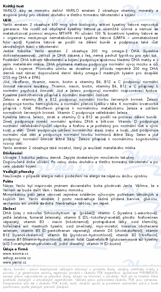 YARILO...aby se miminku dařilo! YARILO einstein 2 obsahuje vitamíny, minerály a stopové prvky pro období druhého a třetího trimestru těhotenství a kojení.