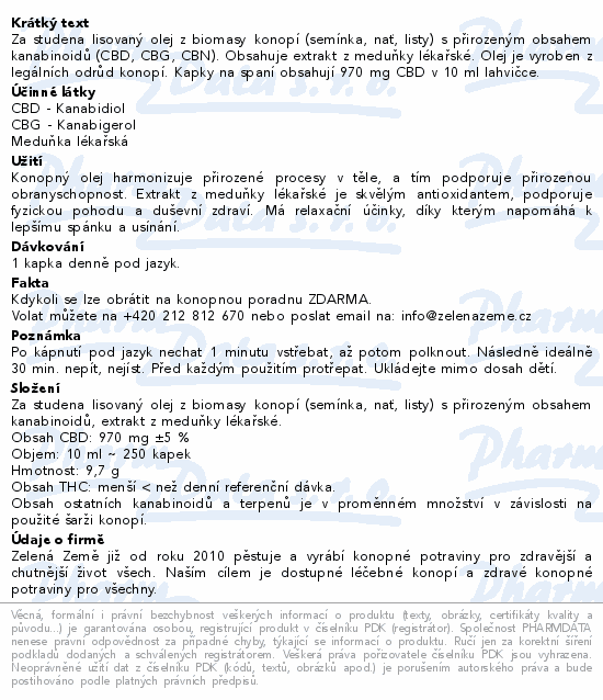 Za studena lisovaný olej z biomasy konopí (semínka, nať, listy) s přirozeným obsahem kanabinoidů (CBD, CBG, CBN). Obsahuje extrakt z meduňky lékařské. Olej je vyroben z legálních odrůd konopí. Kapky na spaní obsahují 970 mg CBD v 10 ml lahvičce.