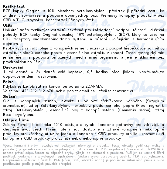 BCP kapky Original s 10% obsahem beta-karyofylenu představují přírodní cestu ke zklidnění, rovnováze a podpoře obranyschopnosti. Prémiový konopný produkt – bez CBD a THC, s vysokou koncentrací účinných látek.