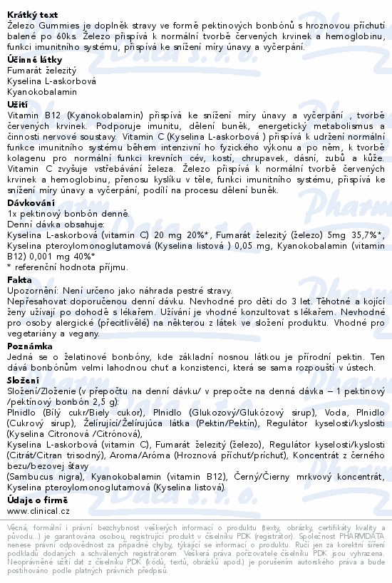 Železo Gummies je doplněk stravy ve formě pektinových bonbónů s hroznovou příchutí balené po 60ks. Železo přispívá k normální tvorbě červených krvinek a hemoglobinu, funkci imunitního systému, přispívá ke snížení míry únavy a vyčerpání.