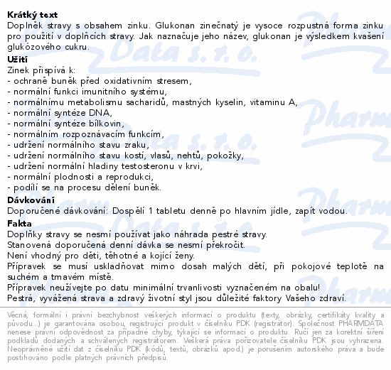 Doplněk stravy s obsahem zinku. Glukonan zinečnatý je vysoce rozpustná forma zinku pro použití v doplňcích stravy. Jak naznačuje jeho název, glukonan je výsledkem kvašení glukózového cukru.