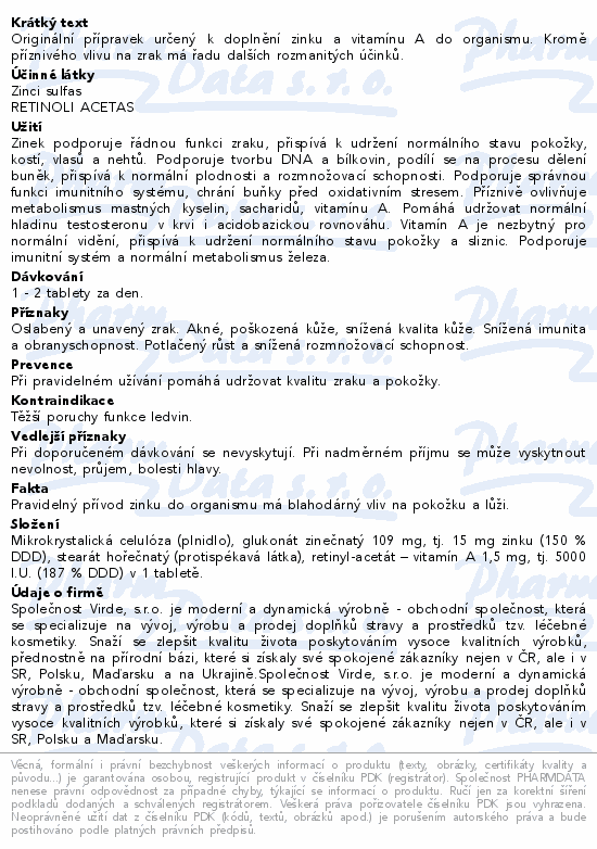 Originální přípravek určený k doplnění zinku a vitamínu A do organismu. Kromě příznivého vlivu na zrak má řadu dalších rozmanitých účinků.