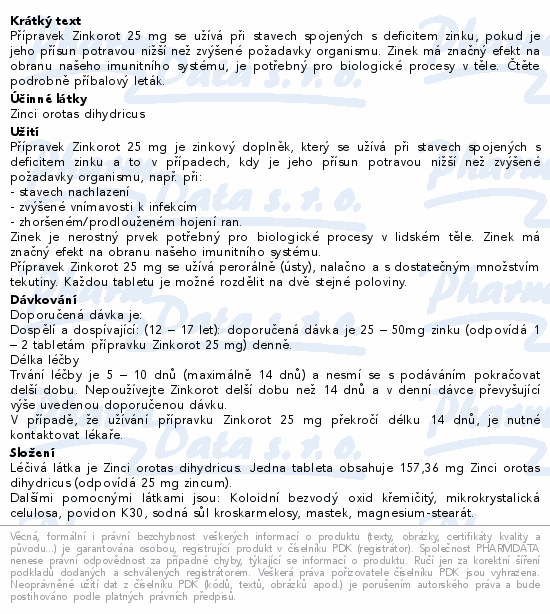 Přípravek Zinkorot 25 mg se užívá při stavech spojených s deficitem zinku, pokud je jeho přísun potravou nižší než zvýšené požadavky organismu. Zinek má značný efekt na obranu našeho imunitního systému, je potřebný pro biologické procesy v těle. Čtěte pozorně příbalový leták.