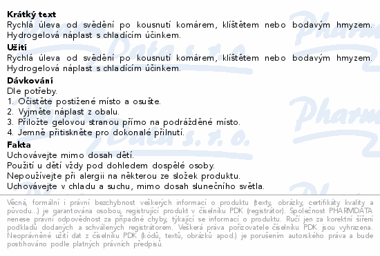 Rychlá úleva od svědění po kousnutí komárem, klíštětem nebo bodavým hmyzem. Hydrogelová náplast s chladícím účinkem.