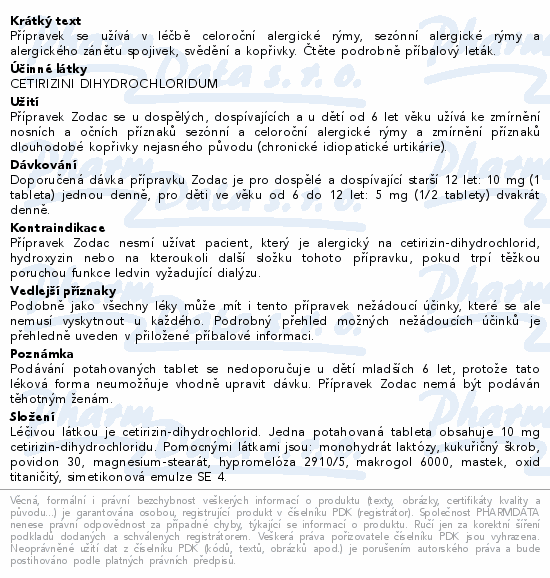 | Farmako-terapeutická skupina, účinné látky: | RESPIRAČNÍ SYSTÉM -> ANTIHISTAMINIKA PRO SYSTÉMOVOU APLIKACI -> ANTIHISTAMINIKA PRO SYSTÉMOVOU APLIKACI -> PIPERAZINOVÉ DERIVÁTY -> CETIRIZIN |