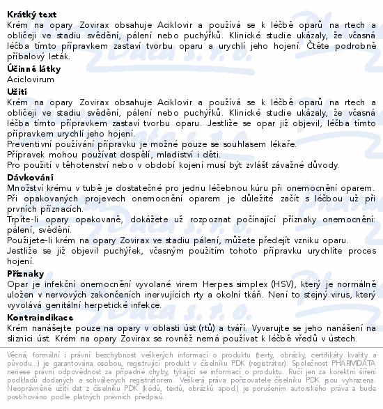 Krém na opary Zovirax obsahuje Aciklovir a používá se k léčbě oparů na rtech a obličeji ve stadiu svědění, pálení nebo puchýřků. Klinické studie ukázaly, že včasná léčba tímto přípravkem zastaví tvorbu oparu a urychlí jeho hojení. Čtěte pozorně příbalový leták.