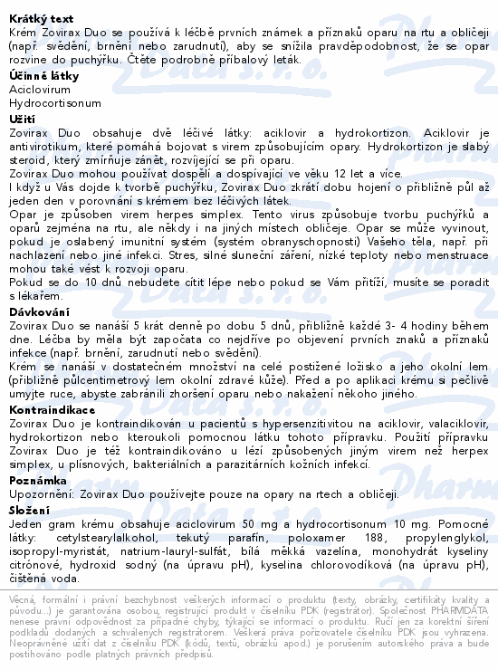 Krém Zovirax Duo se používá k léčbě prvních známek a příznaků oparu na rtu a obličeji (např. svědění, brnění nebo zarudnutí), aby se snížila pravděpodobnost, že se opar rozvine do puchýřku. Čtěte pozorně příbalový leták.